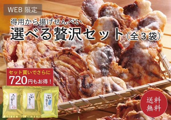 "いかせんべい甘塩だれ""たこせんべいから揚"を食べ始めたら、パリッとした食感と香ばしさで手と口が止まりませんでした。最高のおいしさをありがとうございました。