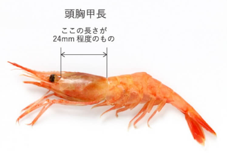 5年目(5歳)のものが、身に栄養があり一番美味しいとされています。5歳の甘えびの見分け方として、頭胸甲長部が24mm程度のものを選んでください。