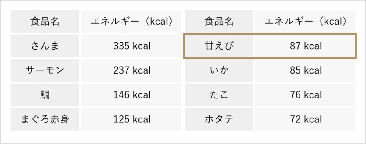 生の甘えびは87kcalと、魚介類の中でかなりカロリーが低めです。