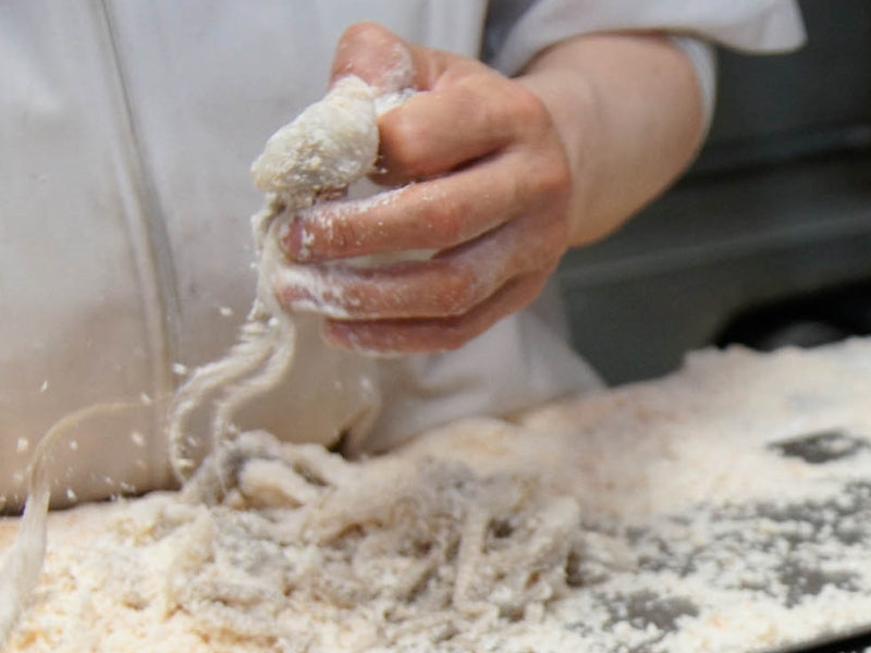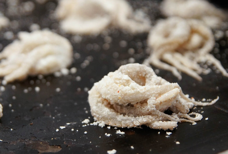 から揚げせんべいの美味しさは、熟練された職人の技によって生み出されます。素材が天然海産物なので、水分量や大きさ、形が1匹ごとに異なります。その為、洗浄の加減やでん粉の量、鉄板への置き方、挟み焼きの際の強さ・時間などを職人が調整しています。揚げる際にも、季節・気温・湿度などを考慮して、油のブレンド割合や揚げ時間を職人の手により調整しています。
