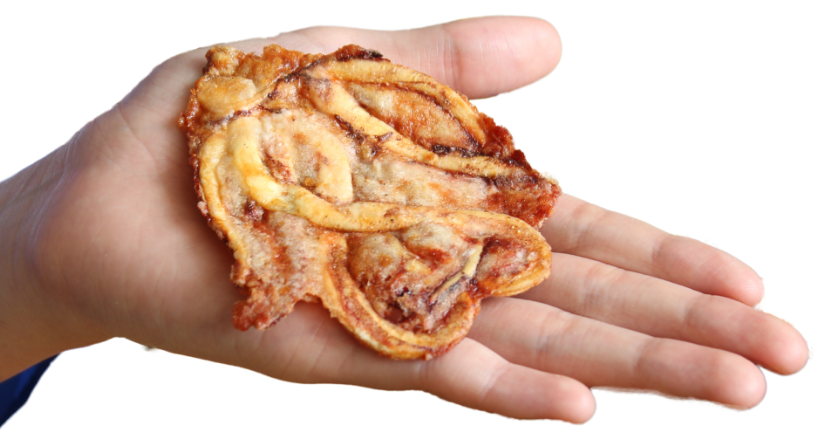 「生地に風味を付け加えて作る一般的な海鮮せんべい」とは違い、から揚げせんべいは、本物のたこ・いか・えびを丸ごとそのままの姿で挟み焼きしパリパリに揚げた、特別な製法のせんべいです。海の幸がそのまませんべいになったので、パリパリの食感と共に、噛むほどに素材本来の旨味と香りが口の中いっぱいに広がります。