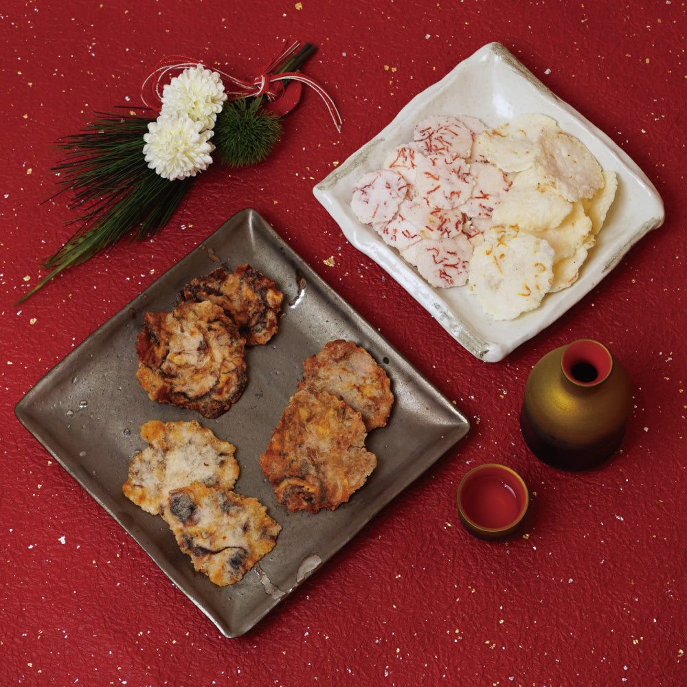 大人気のから揚げせんべいシリーズ3種と、今だけの限定商品2種を詰合せました。