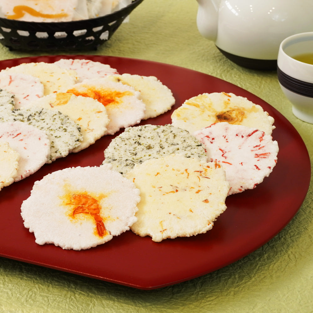 「わかめ・かに・甘えび・あさり・いか」の5種のお煎餅が、お手頃価格で味わえる袋入りのお得な一品です。